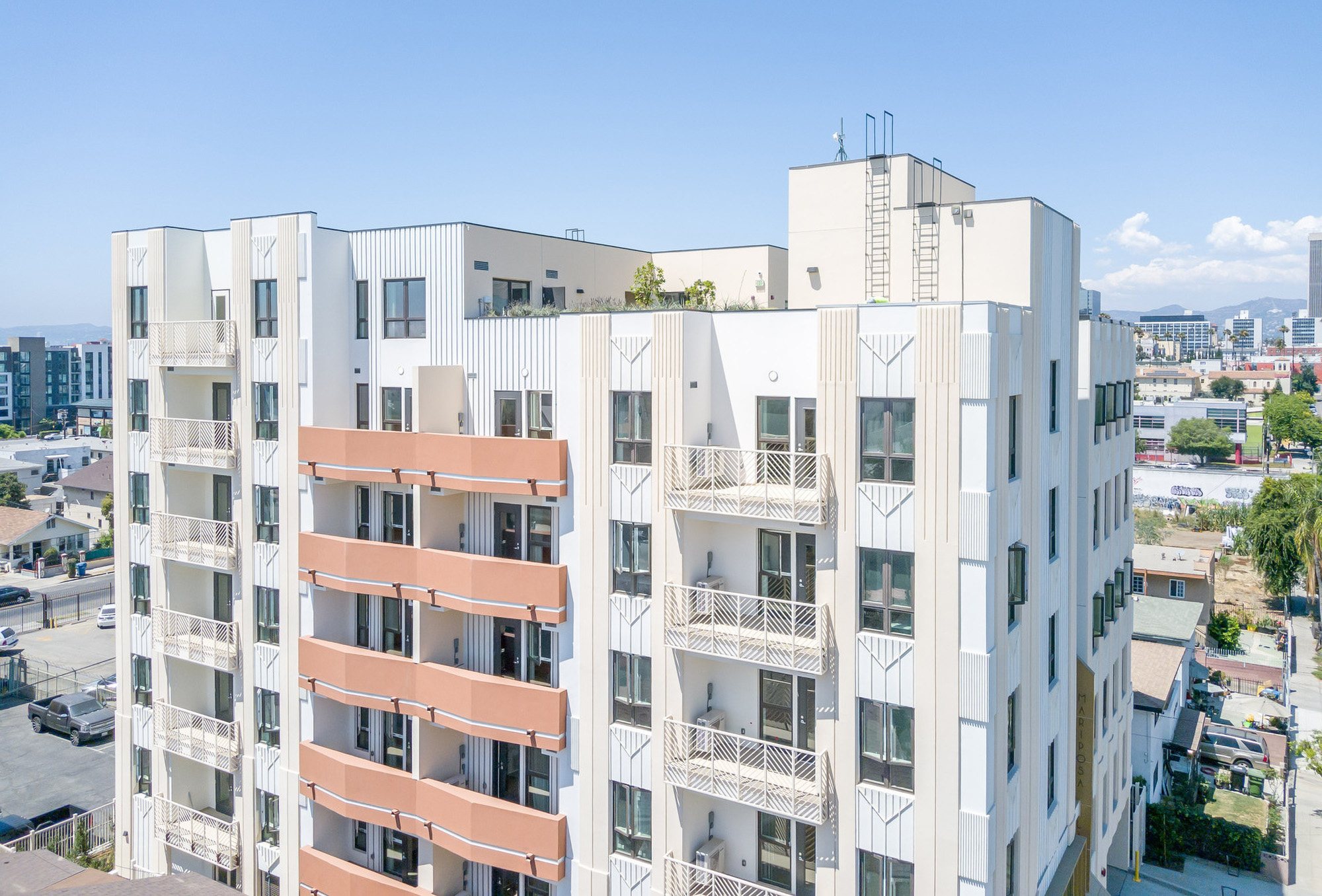 Featuring 41 units, the art deco-inspired project includes five stories built over one story podium and a subterranean garage on a city-owned lot located at 1047-1055 S. Mariposa Avenue. Twenty of the units provide permanent supportive housing for homeless individuals, while twenty were made available through a lottery process to households earning 60% of the area median income. One unit is reserved for an on-site property manager. Of the twenty supportive housing units, five are reserved for individuals with mobility disabilities and two support hearing/vision disabilities; with a total land area of 11,807 square feet, the total floor area ratio (FAR) is 3.21, while the 41 total units generates a density of 151 units per acre.